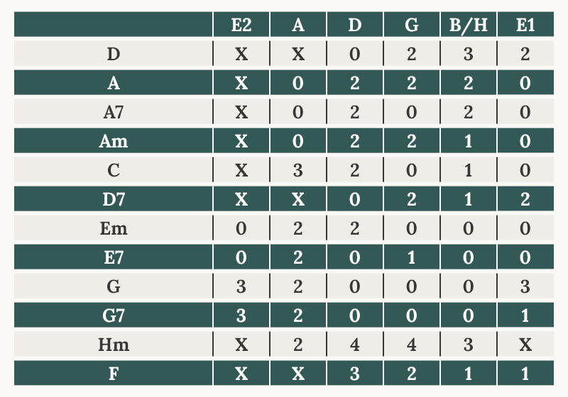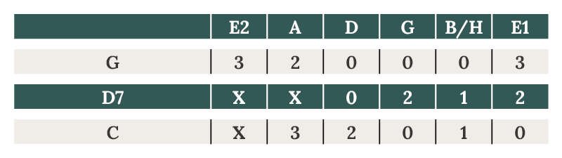 Die Tabulatur an sich erklären wir Dir am besten an der von D-Dur, welches ganz oben in der Liste steht. Das X bedeutet, dass ihr diese Saite nicht anspielen müsst. Im Falle D-Dur also die tiefe E-Saite und die A-Saite. Die 0 der D-Saite bedeutet die Leersaite soll angeschlagen werden. Mit der Nummer 1, 2 und mehr wird dargestellt, dass ihr diese Saite in diesem Bund 1, 2 usw. mit den Fingern greifen bzw. herunterdrücken sollt, um den Akkord zu bekommen beim Spielen. Im Falle D-Dur also die G-Saite im 2. Bund drücken, die B/H-Saite im 3. Bund und die hohe E-Saite im 2. Bund drücken. Dann anschlagen und zack ist der Akkord da. Wenn es schnarrt, musst du etwas fester drücken oder deinen Griff mal überprüfen.