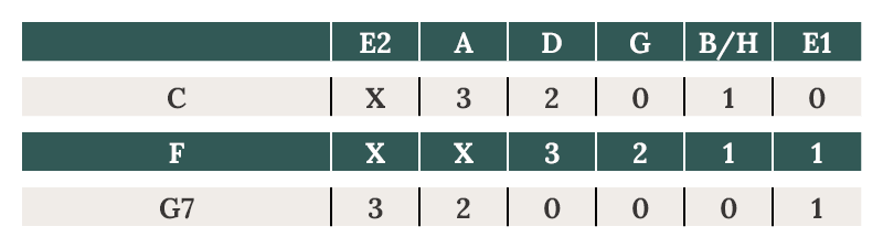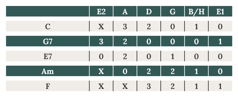 Zuerst die Tabulaturen der Akkorde, die ihr braucht: