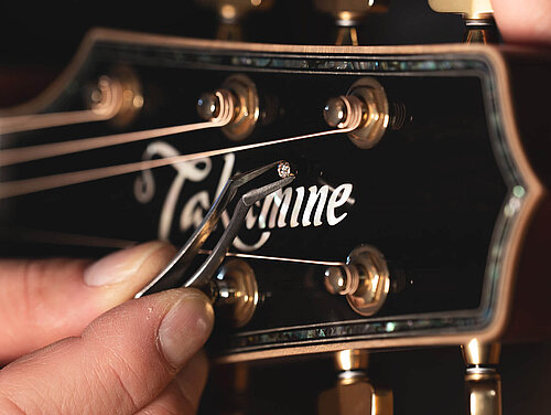 Schau Dir die Bünde einer beliebigen Takamine doch einmal aus nächster Nähe an. Sie sind das Ergebnis eines lasergesteuerten Verarbeitungssystems mit einer Toleranz von verschwindend kleinen 0,0025 mm. Greife ein paar Noten und Akkorde und achte darauf, wie die Saiten auf der Bundmitte aufliegen – und wie klar alle Noten perlen. Diese Detailfreude macht den Unterschied zwischen einer guten und einer herausragenden Gitarre aus.