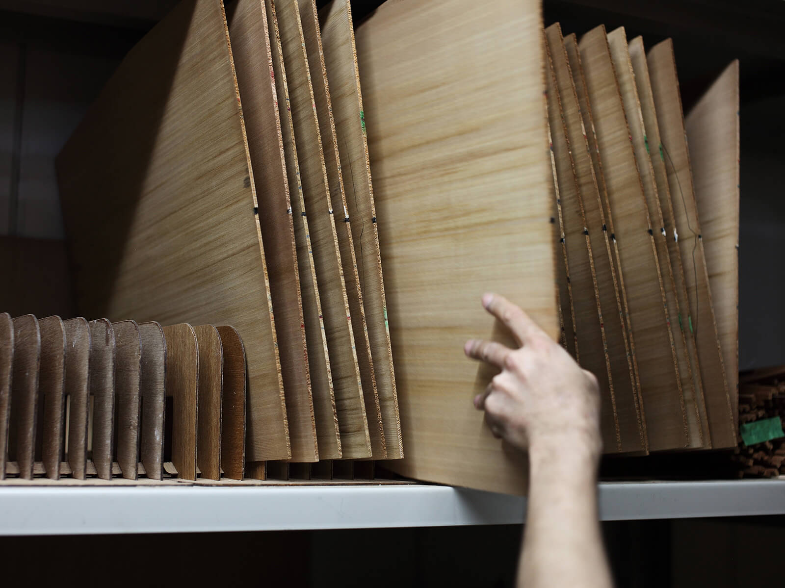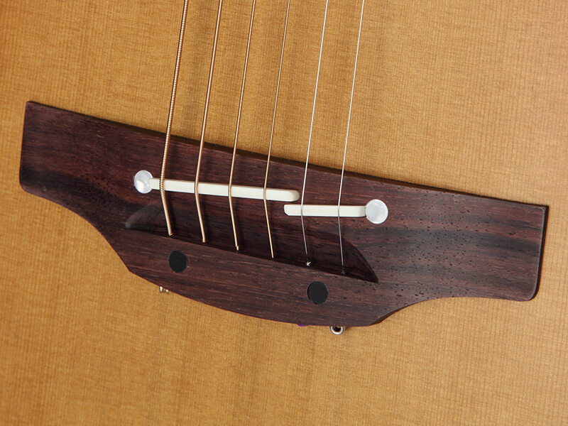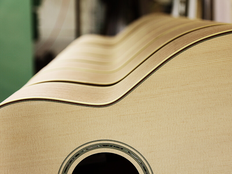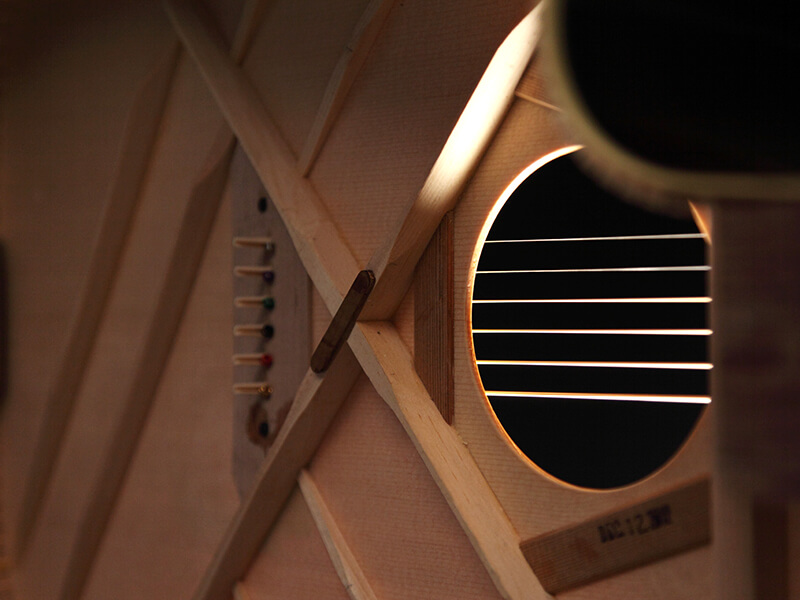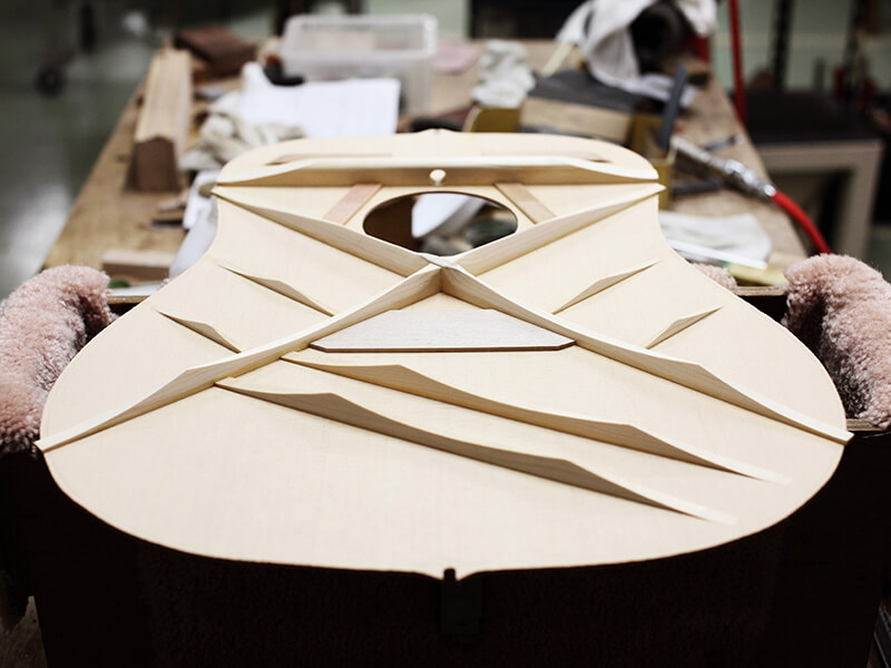 Decken aus Fichte oder Zeder werden schon seit über einem Jahrtausend bevorzugt verwendet, und an der heutigen Deckenverstrebung hat sich seit gut 150 Jahren kaum etwas verändert. In unseren Westerngitarren verwenden wir ein traditionelles X-Bracing und stimmen das sogenannte Voicing jeweils auf den bevorzugten Einsatzbereich wie z. B. Fingerpicking oder Strumming ab.