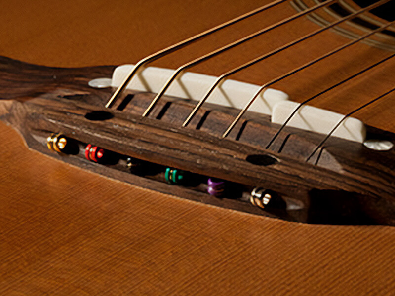 Vergiss die Mühe, die einem Saitenstöckerl/Pins bereiten können. Zahlreiche Takamine-Gitarren der Pro-Serie sind mit praktischen „stöckerlfreien“ Stegen versehen und erlauben entsprechend schnelle Saitenwechsel.