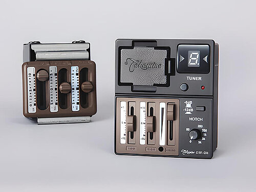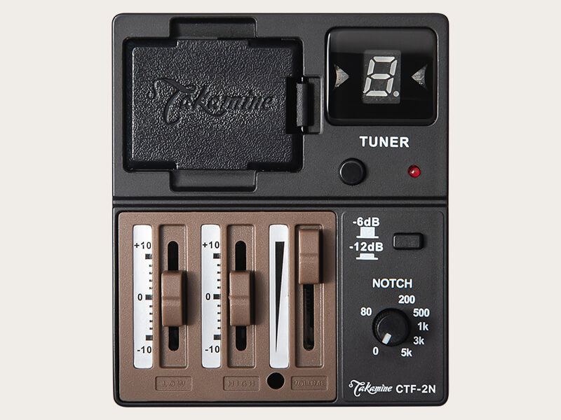 Der Notch-Filter, der im CT4-DX und späteren Takamine-Vorverstärkern eingebaut ist, kann eine ausgewählte Zielfrequenz zwischen 0 Hz und 5 kHz abschneiden. Er kann auch als Mid-Cut-EQ verwendet werden und die Tiefe der Absenkung durch Umschalten von -6dB/-12dB steuern. Der neue CTF-2N verfügt außerdem über ein leicht ablesbares chromatisches Stimmgerät. Und da Takamine gerade dabei sind, ihre Innovationsgeschichte zu feiern, sei zu erwähnen, dass das weltweit erste chromatische Stimmgerät bereits 1998 im digitalen Vorverstärker AD-1 von Takamine eingebaut wurde. Eine Funktion, die inzwischen bei vielen akustisch-elektrischen Vorverstärkern zum Standard gehört.