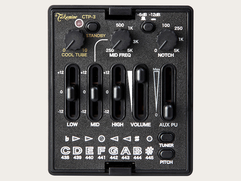 Der Takamine Cool Tube Preamp CTP-3 ist die bedeutendste Entwicklung im Bereich der akustischen „Onboard”-Signalverarbeitung seit der Einführung des digitalen Takamine DSP-Preamps im Jahre 1998. Der CTP ist ein vielseitiger, röhrenbetriebener akustisch-elektrischer Vorverstärker/Mixer, der eine Dual Triode Vakuumröhre zur Klangerzeugung nutzt.