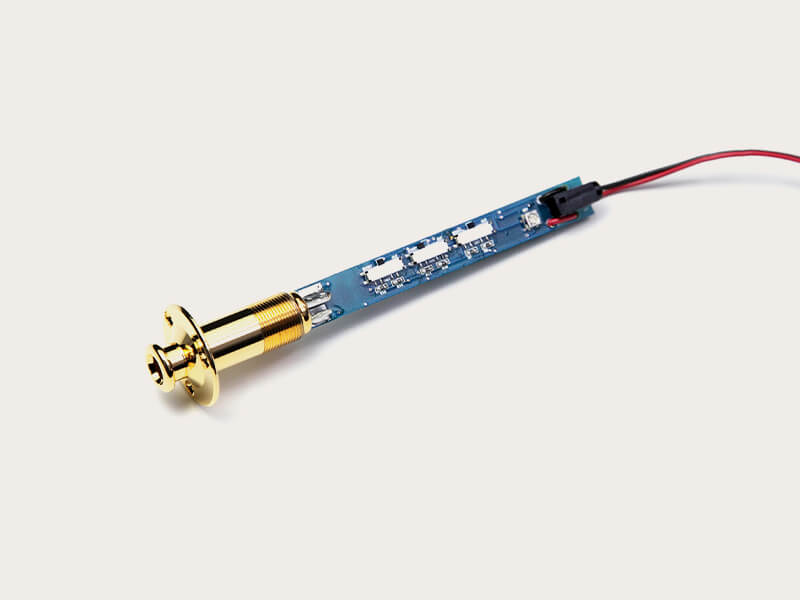 Der Takamine Line Driver-Preamp TLD-2 ist eine unkomplizierte Schaltung zum Puffern des Tonabnehmers und Anheben des Signalpegels, um einer Beeinträchtigung durch ein langes Kabel vorzubeugen. Dank minimaler Schaltungen ist sie klangneutral und leise. Sie wird separat in die Ausgangsbuchseneinheit montiert und ist nach außen hin unsichtbar. Der TLD-2 bietet 3 intuitiv bedienbare Klangregler – falls Du dir diese Mühe überhaupt machen möchtest. Normalerweise ist die Werkseinstellung des TLD-2 perfekt auf unseren Palathetic-Tonabnehmer abgestimmt und liefert einen warmen und authentischen Akustik-Sound, der unsere bisherigen Ansätze noch übertrifft – und das ist doch schon einmal eine Ansage.