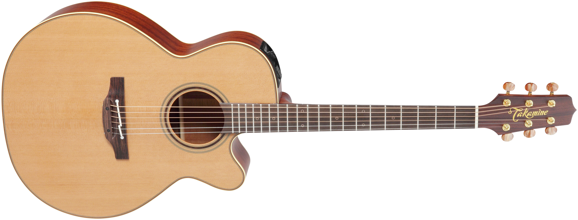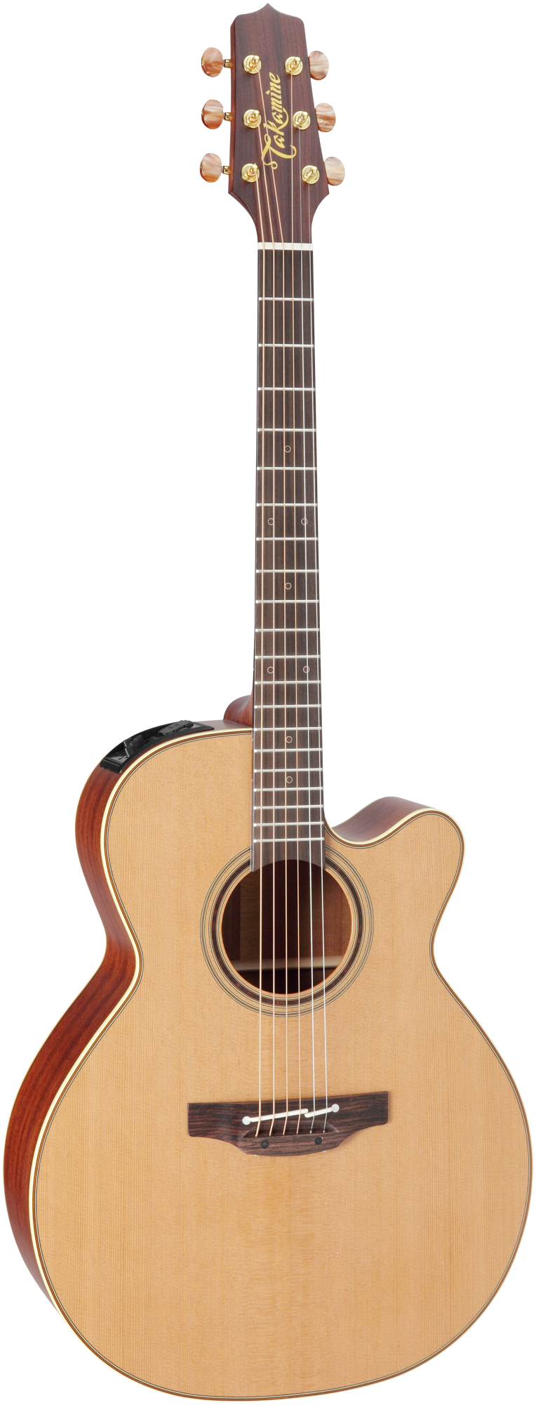 Die Takamine Pro Series P3NC Cutaway NEX vereint satten Akustik-Sound und eine durchdachte Ausstattung mit einer State-of-the-Art Elektronik. Die Kombination von massiver Zederndecke und massivem Sapele-Boden sorgt für einen vollen und warmen Ton ohne lange Einspielzeit. Durch die komplett handgefertigte Verbalkung holen die Gitarrenbauer bei Takamine dabei immer das Maximum an Sound aus jedem einzelnen Instrument. Der elegante Cutaway bietet einen optimalen Zugang zu den oberen Lagen. Für eine einwandfreie Intonation über das gesamte Griffbrett verwendet Takamine die einzigartige Takamine Split-Bridge, die Stegeinlage aus Knochen sorgt für einen natürlichen Klang und geringe Reibungswerte. Mit dem bewährten CT4B II Preamp System mit Dreiband-EQ, Lautstärkeregler und eingebautem chromatischem Stimmgerät ist die Takamine P3NC direkt startklar für jede Bühne. Die feinen Gold-Mechaniken mit bernsteinfarbenen Buttons sehen nicht nur edel aus, sondern arbeiten auch enorm exakt und weich. Den optischen Auftritt runden das stilvolle Ivoroid-Binding mit dunklem Purfling, aufwändige Holz-Inlays und ein hauchdünnes Natural Satin Finish ab.