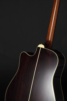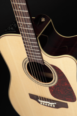 Weitere überzeugende Merkmale sind das Cutaway für einen problemlosen Zugriff auf die höchsten Bünde sowie Takamines asymmetrisches Halsprofil mit einer geringeren Stärke im Bassbereich für ein ergonomischeres Spielgefühl und einer optimierten Spielbarkeit. Der zweigeteilte Stegeinlage aus Knochen erleichtert eine saubere Intonation, die Platzierung der Stöckerl wurde im Hinblick auf ein langes Sustain und eine optimale Präsenz gewählt.